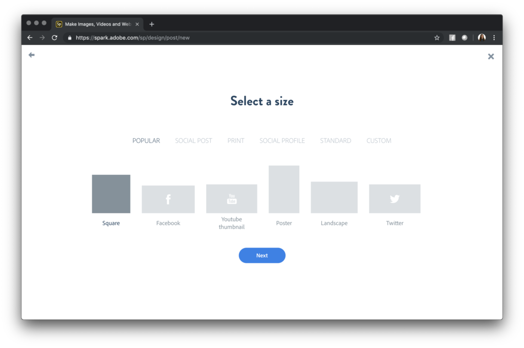 For the meme I share in this blog post, I started from scratch and first chose the shape and size of my graphic. These sizes are optimized for different social media platforms. You can resize your graphic at any time and even add custom dimensions. I chose a square to keep it simple.