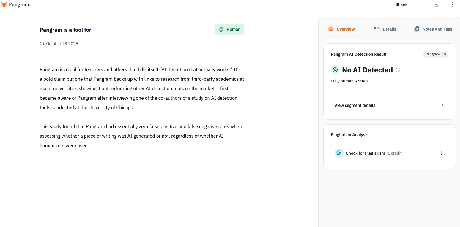 I was impressed with the research demonstrating Pangram’s efficacy at correclty identifying AI writing vs. human writing, but I still wanted to see how it did in my educational and writing settings.